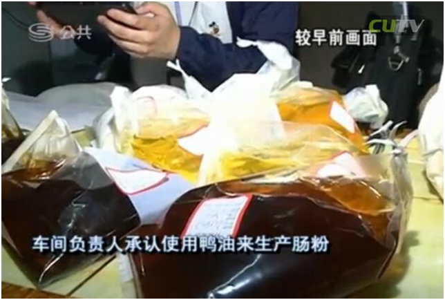 在執(zhí)法人員查獲6桶來歷不明的油之后,車間負(fù)責(zé)人承認(rèn)使用鴨油來生產(chǎn)腸粉?!斑@是什么油?”“是鴨油?!薄翱绝喪O碌哪欠N?”“對?!?