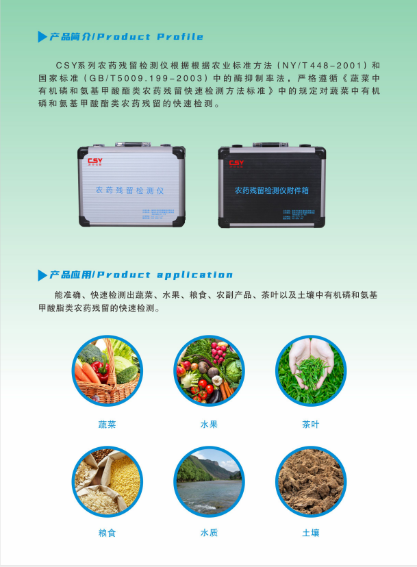 深芬儀器CSY系列農(nóng)藥殘留快速測定儀可以對瓜果蔬菜的農(nóng)藥殘留進行準確的檢測和篩查,杜絕超標的農(nóng)產(chǎn)品流入市場。農(nóng)藥殘留快速測定儀可廣泛應(yīng)用于各級蔬菜檢測中心、農(nóng)貿(mào)市場、超市、環(huán)保機構(gòu)、蔬菜種植基地、飯店、車載及實驗室等食品安全檢測與監(jiān)控場所等單位對果蔬中農(nóng)藥殘留的檢測。
