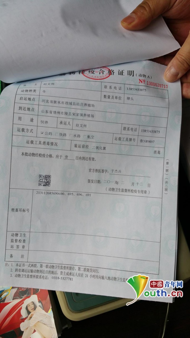 此后中國青年網(wǎng)記者致電編號為1300620717檢疫證明存根聯(lián)上的趙姓“承運(yùn)人”進(jìn)一步核實(shí),對方告訴中國青年網(wǎng)記者,他以前確實(shí)到故城運(yùn)過牛,但“都是半年前的事了”,并不是檢疫證明上寫的2月12號,而且數(shù)量也不對。檢疫證明是“通過中間人開的”,他并沒有見到,并且運(yùn)的是6頭“奶牛”,并不是屠宰用的肉牛。