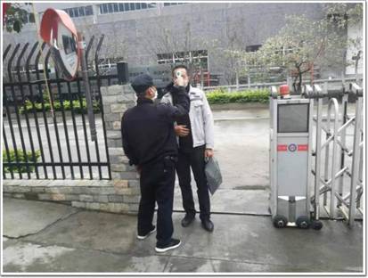 門(mén)衛(wèi)正在為進(jìn)入工廠的員工測(cè)量體溫,做好登記和消毒工作