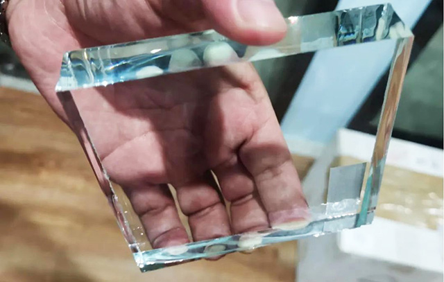 田永剛向記者展示了新福興“至白”優(yōu)質(zhì)浮法玻璃、“至潤(rùn)”超白浮法玻璃。這款為低自爆玻璃而生的產(chǎn)品,厚度在1.2~19mm之間,成分中氧化鐵含量不大于 0.015%,是具有高可見(jiàn)光透射比的平板玻璃。